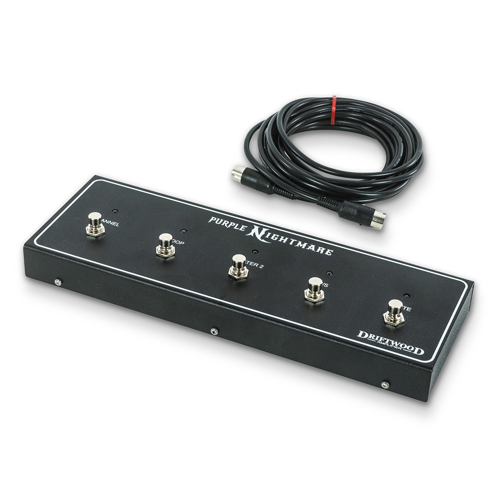 The PurpleNightmare’s 2-Watt Switch engages a Mosfet power amp for quiet practice, saving tube wear and allowing use without a speaker. Channels, Loop, and T/S can be switched via the amp or footswitch. A MIDI box enables full remote control. Rotary switches let you assign