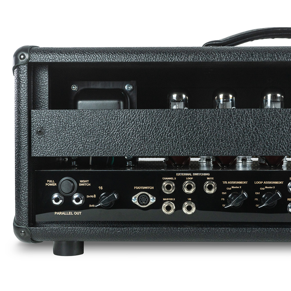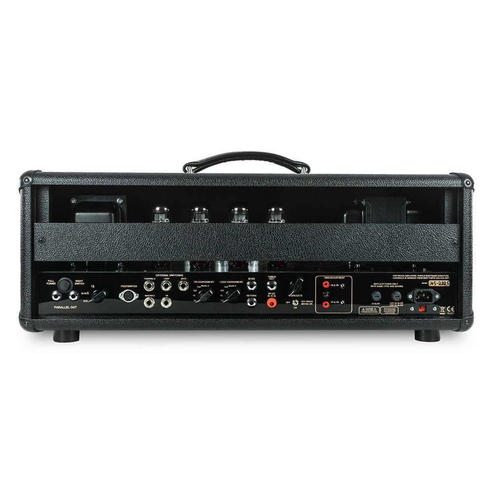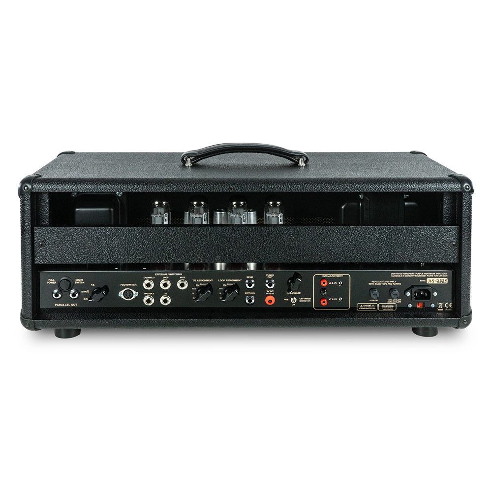 The Purple Nightmare Signature Features versatile power amps. After the preamp stage, a tube-buffered Effect Loop can be always on, foot-switched, or assigned to a channel or Master 2. Master 2 boosts volume for solos, while Sharp and Rumble knobs adjust highs and lows to fit Speakers or rooms. Four EL34 tubes deliver 100W, with easy bias adjustments.
